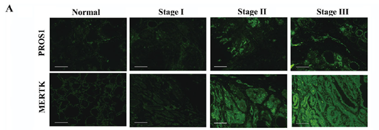 此外,该试剂盒还用于验证 PROS1 和 MERTK 的组织表达差异:在进展期组织的肿瘤区域,PROS1 和 MERTK 的荧光信号强度较正常组织提升 3-5 倍,进一步佐证了该轴的激活与疾病进展的关联性。