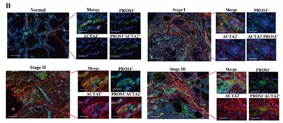 染色靶标:ACTA2(成纤维细胞标志物,红色)、PROS1(绿色)、DAPI(细胞核,蓝色);