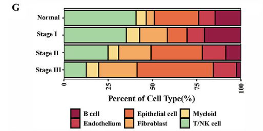 成纤维细胞比例显著上升(从正常组织的约 5% 升至 III 期的 18%),成为微环境的核心 “信号发送者"。
