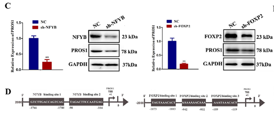 成纤维细胞中,NFYB 和 FOXP2 可直接结合 PROS1 启动子,激活其转录;