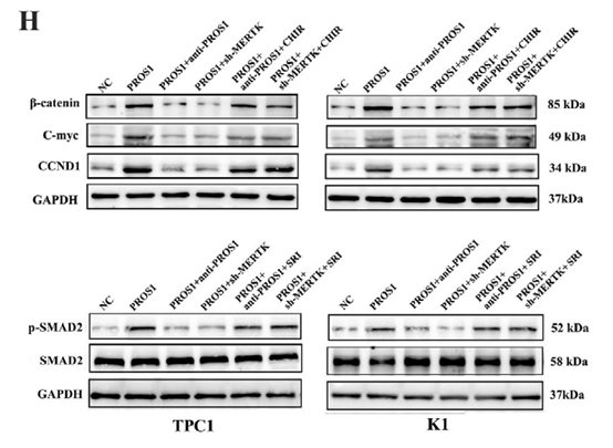 PROS1 结合 MERTK 后,激活下游 WNT/β-catenin 和 TGF-β/SMAD2 通路,促进肿瘤细胞增殖、侵袭;