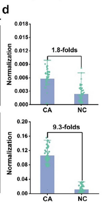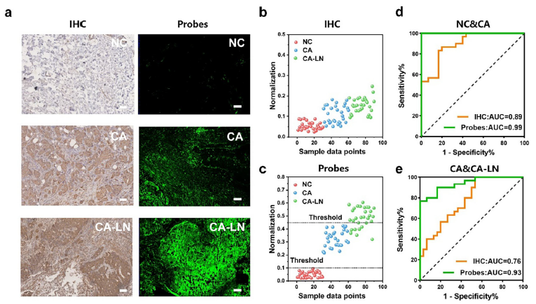 3. 精准区分转移组织 原文图 4a 对比了正常组织(NC)、原发肿瘤(CA)、转移肿瘤(CA-LN)的染色效果:Absin 抗体加持的探针能通过荧光强度梯度(CA-LN > CA > NC)清晰区分转移组织,而 IHC 的荧光差异微弱;对应的 ROC 曲线(原文图 4e)显示,探针的 AUC=93%,显著高于 IHC 的 76%,诊断灵敏度和特异性全mian领xian。