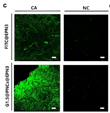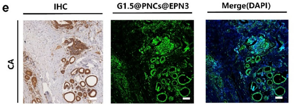2. 与病理金标准高度一致 原文图 3e 显示,对同一份临床组织样本,“G1.5@PNCs@EPN3 探针染色"与“传统 IHC 染色"的肿瘤区域wan全重合,证明探针的诊断可靠性;且探针成像更快速(10 分钟 vs IHC 数小时),无需复杂染色步骤。