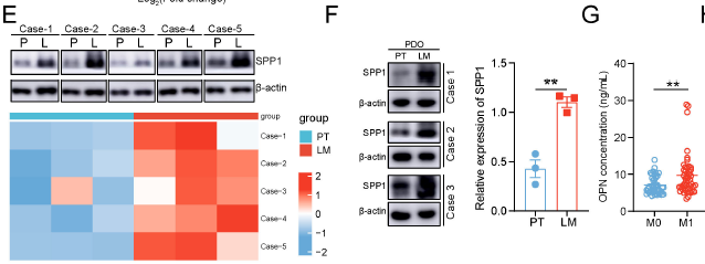 CRLM 组织中 SPP1 蛋白水平较原发灶显著升高(Western blot,对应原文 Fig. 1E),患者血浆 SPP1 水平在转移组(M1)显著高于无转移组(M0)(ELISA,对应原文 Fig. 1G);