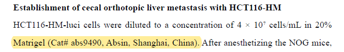 研究团队在 “Establishment of cecal orthotopic liver metastasis with HCT116-HM" 章节明确指出:“HCT116-HM-luci 细胞被稀释至 4×10⁷ cells/mL 的 20% Matrigel(Cat# abs9490, Absin, Shanghai, China)中;麻醉 NOG 小鼠后,将 25μL 细胞悬液注射到盲肠壁,构建原位转移模型,术后通过活体成像监测肝转移情况。"