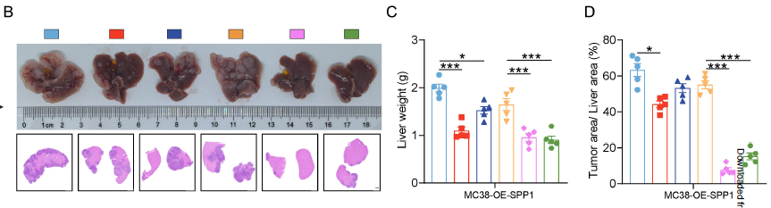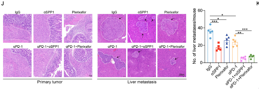 抗 SPP1 抗体或 plerixafor(CXCR4 拮抗剂)联合抗 PD-1,可使 CRLM 小鼠肝转移灶减少 50% 以上(H&E 染色);