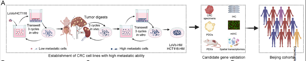 通过 “体外 Transwell 筛选 + 体内脾注射转移模型",建立高肝转移潜能细胞系(LoVo-HM/HCT116-HM);结合空间转录组、单细胞测序及 GEO 数据库(GSE41568 等)交叉分析,发现SPP1 是唯yi在 CRLM 中持续上调的基因。