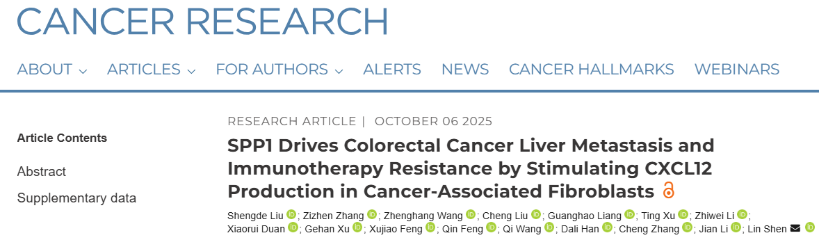 结直肠癌(CRC)是全qiu第三大常见癌症,约 30%-40% 的患者会发生肝转移(CRLM),而免疫治疗在 CRLM 患者中疗效有限 —— 核心症结在于肿瘤微环境(TME)的免疫抑制特性。近日《Cancer Research》发表重磅研究,首ci系统揭示SPP1 通过激活 CAFs(癌相关成纤维细胞)的 CXCL12 分泌,驱动 CRLM 及免疫治疗耐药的分子机制,为精准靶向治疗提供了新方向。