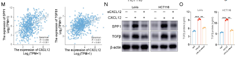 SPP1 并非直接作用于肿瘤细胞,而是通过 “旁分泌" 激活 CAFs:SPP1 刺激 CAFs 分泌 CXCL12,CXCL12 反过来促进 CRC 细胞表达 SPP1 和 TGF-β,形成正反馈 loop;
