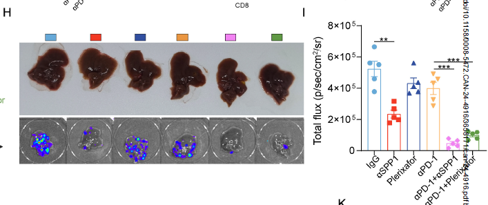 体内实验证实:抗 SPP1 抗体、CXCR4 拮抗剂(plerixafor)或 CAFs 抑制剂(talabostat),可显著恢复 CD8+T 细胞浸润,增强抗 PD-1 治疗效果。