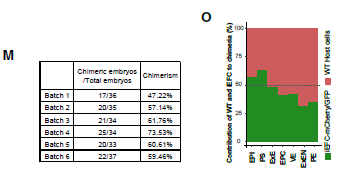体内嵌合实验:iEFCs 能贡献到 E6.5 胚胎的所有组织(包括外胚层、中胚层、内胚层及胎盘、卵黄囊等胚外组织),嵌合效lu最gao达 73.53%。