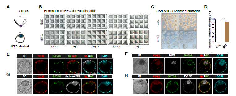 体外实验:iEFCs 可自组织形成囊胚样结构(iEFC-blastoid),效率达 95%,明确表达三大谱系标志物;