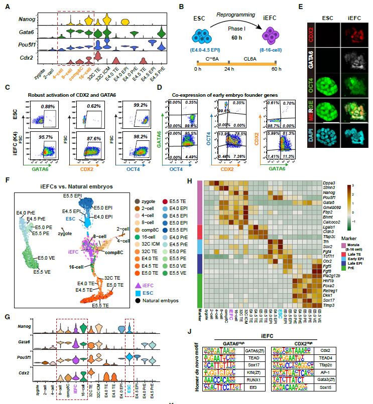 小分子诱导后,iEFCs 共表达 Oct4、Cdx2、Gata6 等早期胚胎标志物,分子特征与 8-16 细胞期天然胚胎高度一致;