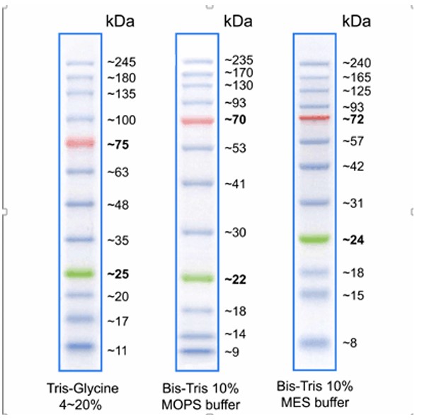 | 描述 | 预染蛋白Marker(10-245KDa)是一种三色预染蛋白标准品,含12种高度纯化预染的蛋白质,涵盖10至245kD的各种分子量。以Tris-glycine buffer体系为例,其中25kD条带为绿色条带,75kD条带为红色条带,其余条带为蓝色。用于Western过程中显示转膜(PVDF、 NC或者nylon膜都适用)是否成功以及显示蛋白的分子量大小。 |
