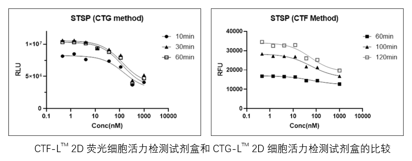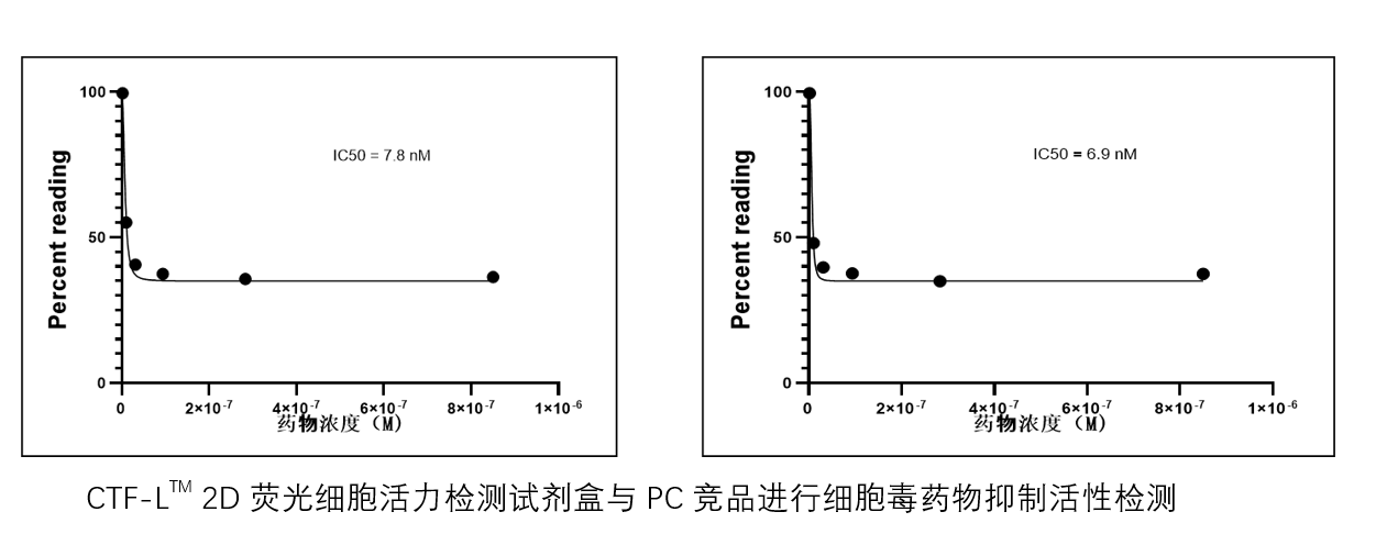| 使用方法 | 1、细胞准备: (1)在 96 孔或 384 孔细胞培养板铺合适密度的待检测细胞。建议使用黑板(如与发光试剂联合使用,可选择白板)。 (2)准备待检化合物。将合适浓度的待检测化合物加到细胞板孔中。培养液中有机溶剂浓度保持在1~2%以下。设立未加化合物的对照组。根据项目需求继续培养合适的时间。 2、细胞活力检测: (1)取出 CTF-LTM细胞活力检测试剂,CTF缓冲液wan全溶解后平衡至室温。CTF底物涡旋振荡使其che底混匀,瞬时离心收集CTF底物至管底 。 (2)配制CTF反应液:CTF底物为100x,根据用量用CTF缓冲液配成1x反应液,充分混匀。 (3)取出待测细胞培养板,每孔加入等体积的CTF反应液,例如100μl培养液加入100μl 1x CTF反应液 。 (4)低速振板20 秒混匀,避光37 ℃ 反应60min 后进行荧光检测 。不同细胞对CTF底物切割速度不同,最佳读板时间需根据细胞优化。最快可以在加入试剂30分钟后进行读板。一般在60分钟或更长时间后读板的结果信噪比更高。建议读板时间最长不超过3hr。 (5)在荧光读板仪上读取荧光信号,激发光Ex 380-400nm,发射光Em 505nm。 (6)根据需要,继续进行下游的多重分析,例如Caspases 3/7 细胞凋亡检测。 | |||||||||||||||